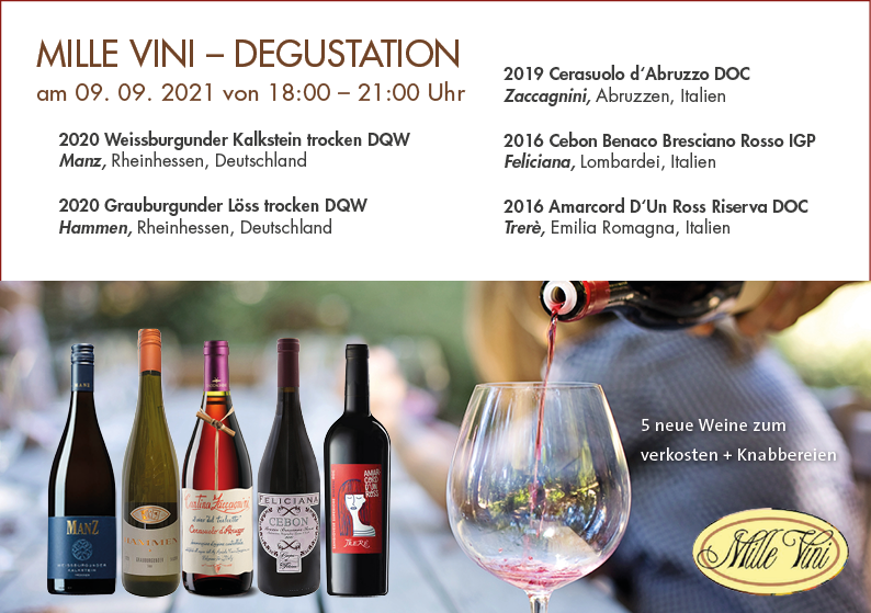 Jeden Donnerstag gegen einem geringen Beitrag von nur EUR 10,- haben Sie die Gelegenheit zur Mille Vini Weinprobe.