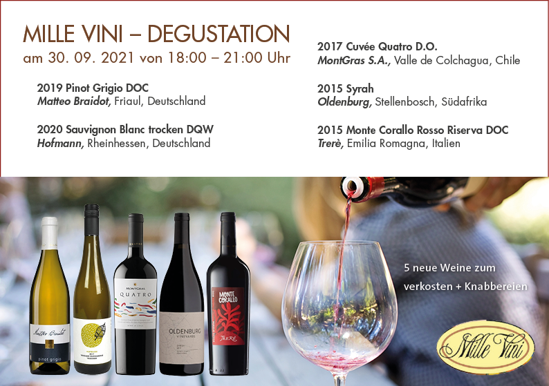 Jeden Donnerstag gegen einem geringen Beitrag von nur EUR 10,- haben Sie die Gelegenheit zur Mille Vini Weinprobe.