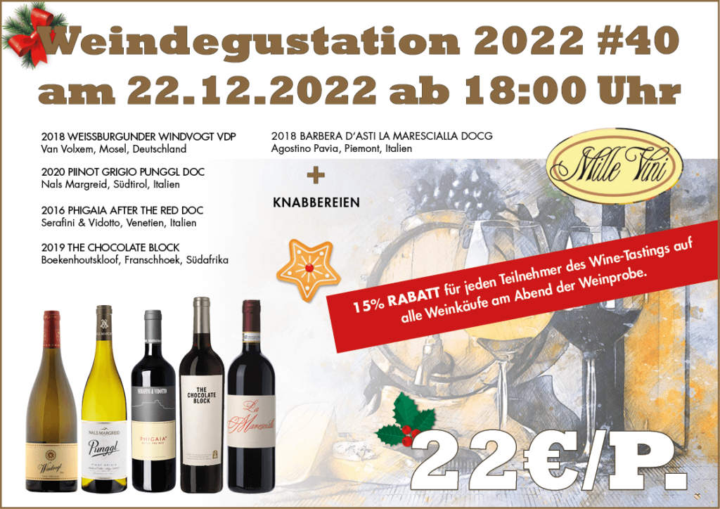 Wir möchten für Euch am 22.12.22 eine vorweihnachtliche Weinprobe der besonderen Art veranstalten.